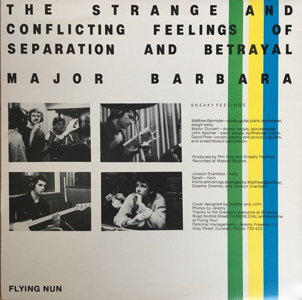 In 1984, Kat left the band and was replaced by John Kelcher of Christchurch. The album came out to good reviews, and the band found themselves in demand. They recorded the singleHusband House b/w "Strange and Conflicting Feelings . . ." and Major Barbara. This came out in 1985 and reached number 17 in the NZ singles charts. It featured cello and horn overdubs and was the group's most complex and accomplished project to date. Another single Better Than Before b/w Wouldn't Cry, Here's to the Other Six (recorded at Strawberry Sound, Dunedin) came out in 1986. Wouldn't Cry was notable for being the first "proper" song David ever wrote!