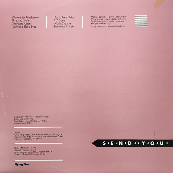 The following year, however, they recorded their debut LP Send You at Mascot Studios in Auckland (as were all their subsequent recordings, with a couple of exceptions). The 16 track studio gave the band the sound they'd been looking for, and the album established the band as a major force in NZ music. It was recorded and mixed in four days and cost about $2000. Much of the bass on the album is actually played on a synthesiser, as Kat had a nerve problem in her arm that prevented her from playing bass with her customary vigour.