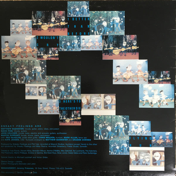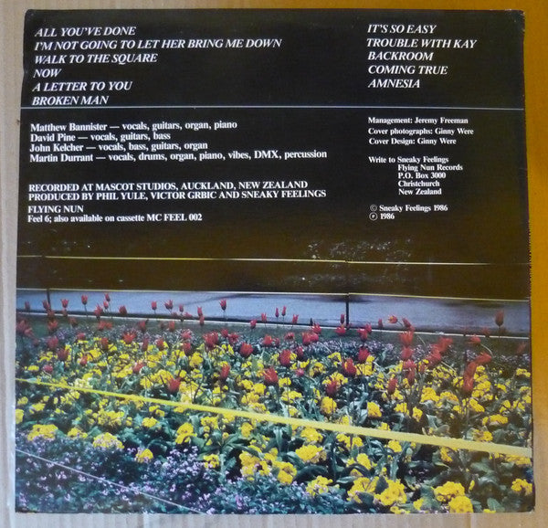 Sneaky Feelings were the poppiest Nun band, preferring poise to noise. They didn't set out to be cool; they set out to make great, hummable records with thoughtful lyrics. Their main musical influences were the Beatles, the Beach Boys, soul music, Fairport Convention, The Brill Building songwriters of the 60s for a start). They formed at Otago University in Dunedin in 1980, where they were all students, and debuted with the Chills in November of that year, mixing original material with covers like Hey Joe played slow like Jimi Hendrix. The line-up eventually settled as a four-piece. David Pine and Matthew Bannister were the guitarists and main songwriters; drummer Martin Durrant also contributed the odd tune. Kat Tyrie played bass.